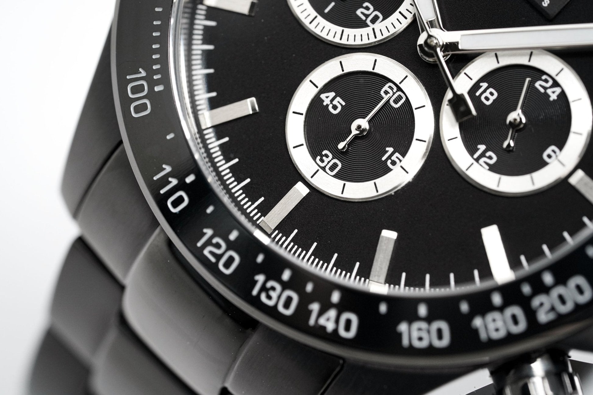 Comes with retail packaging and paperwork. Bold black PVD design with sporty tachymeter functionality.