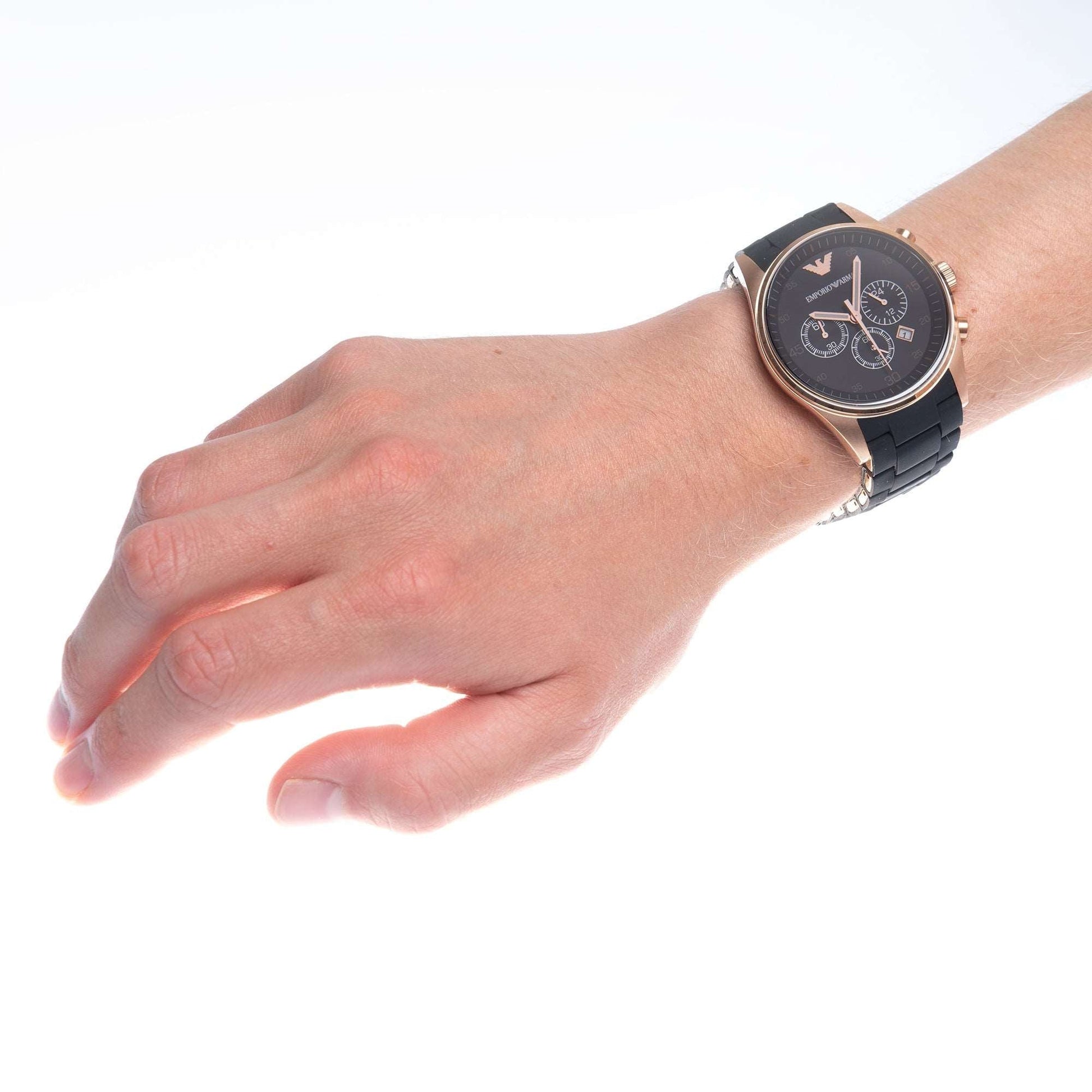 - Reloj Emporio Armani AR5905 con cronógrafo de silicona en negro y oro rosa para hombre