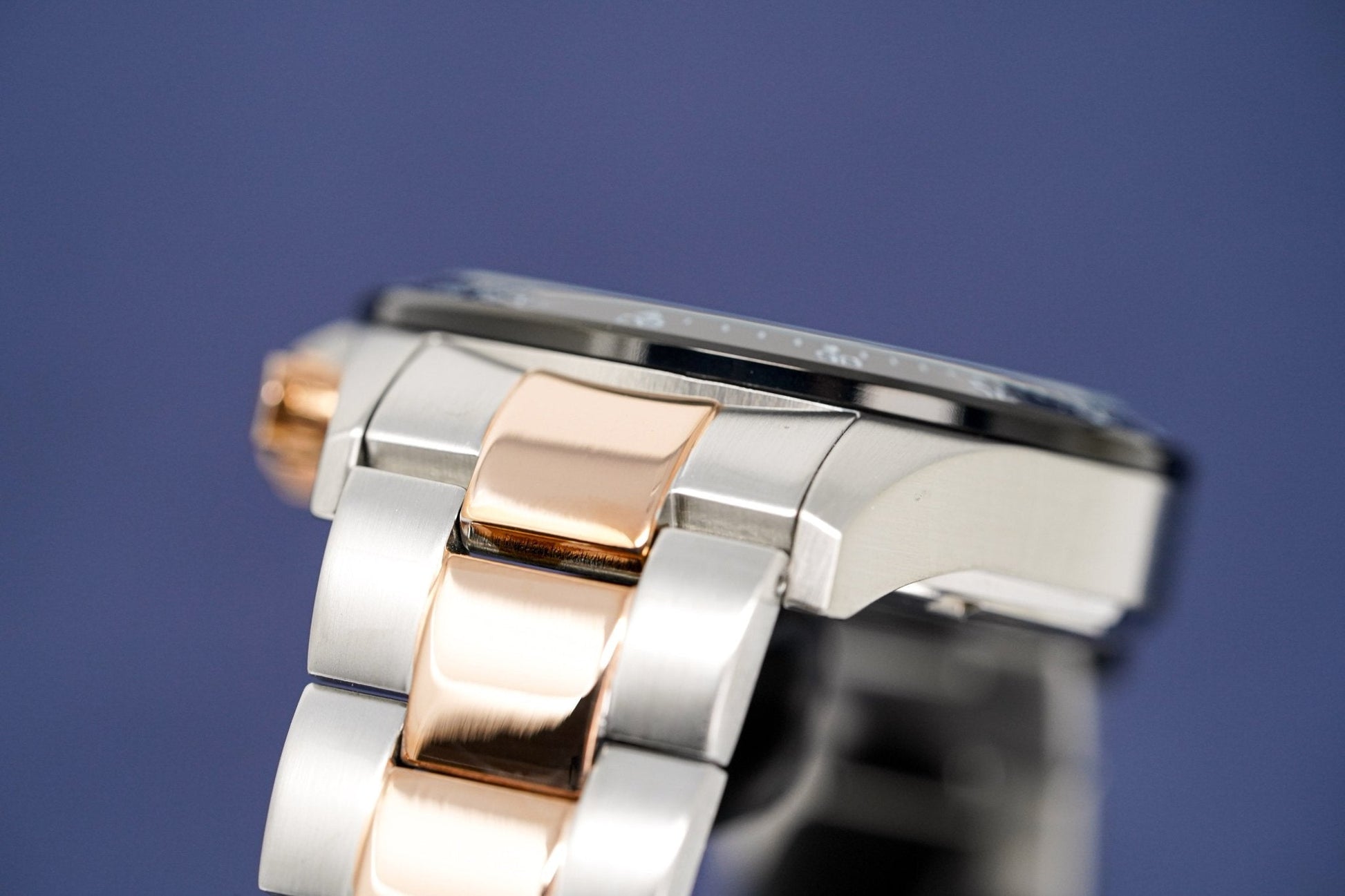 Esfera azul con efecto sol y contorno. Manecillas de acero luminosas. Manecillas de acero inoxidable. Ventana de fecha a las 4:30.