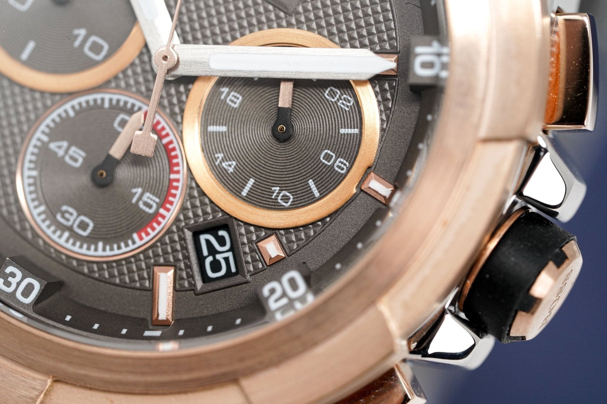 Esfera gris guilloché. Manecillas de acero inoxidable. Índices de acero inoxidable con baño de PVD en oro rosa. Ventana de fecha a las 4:30.