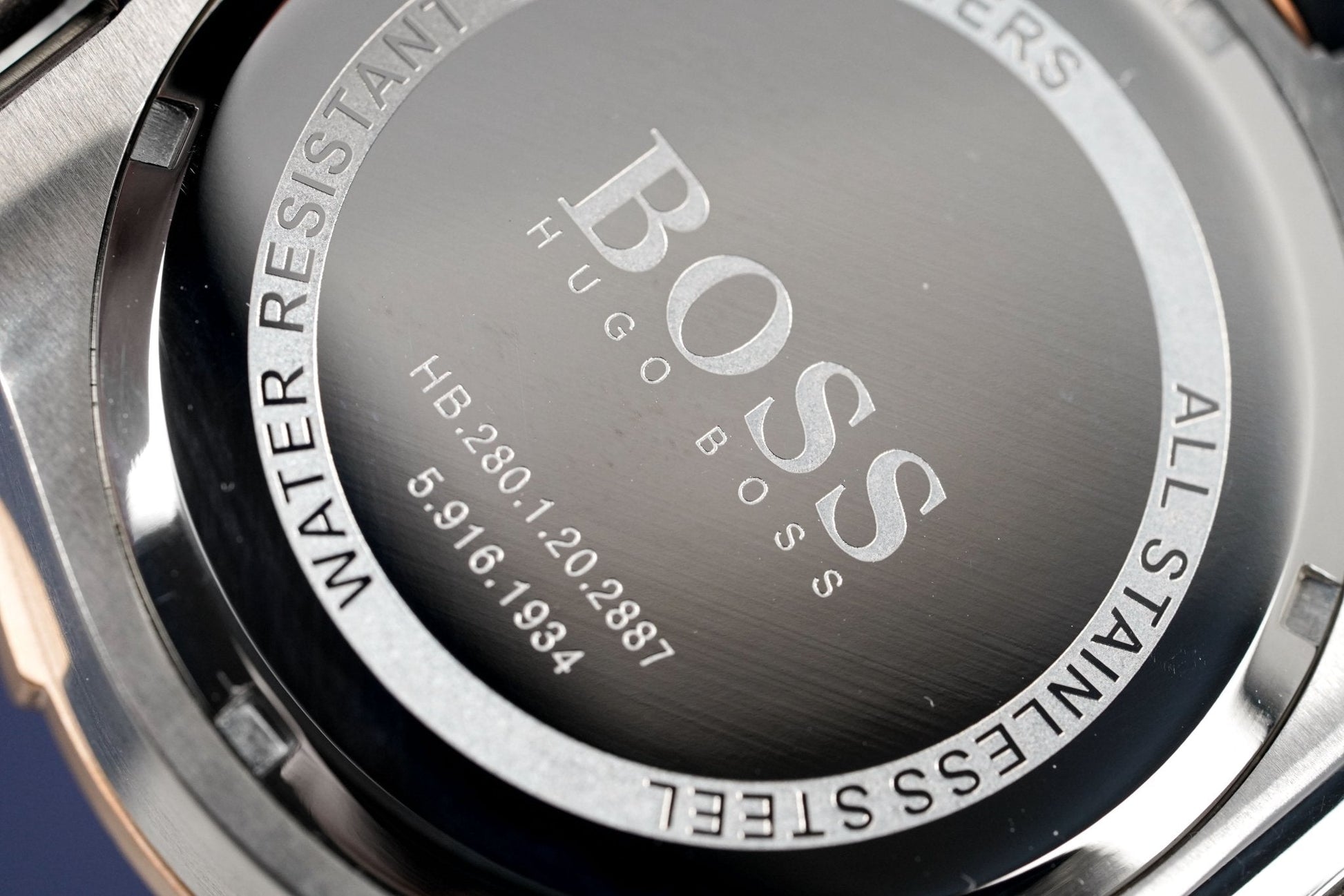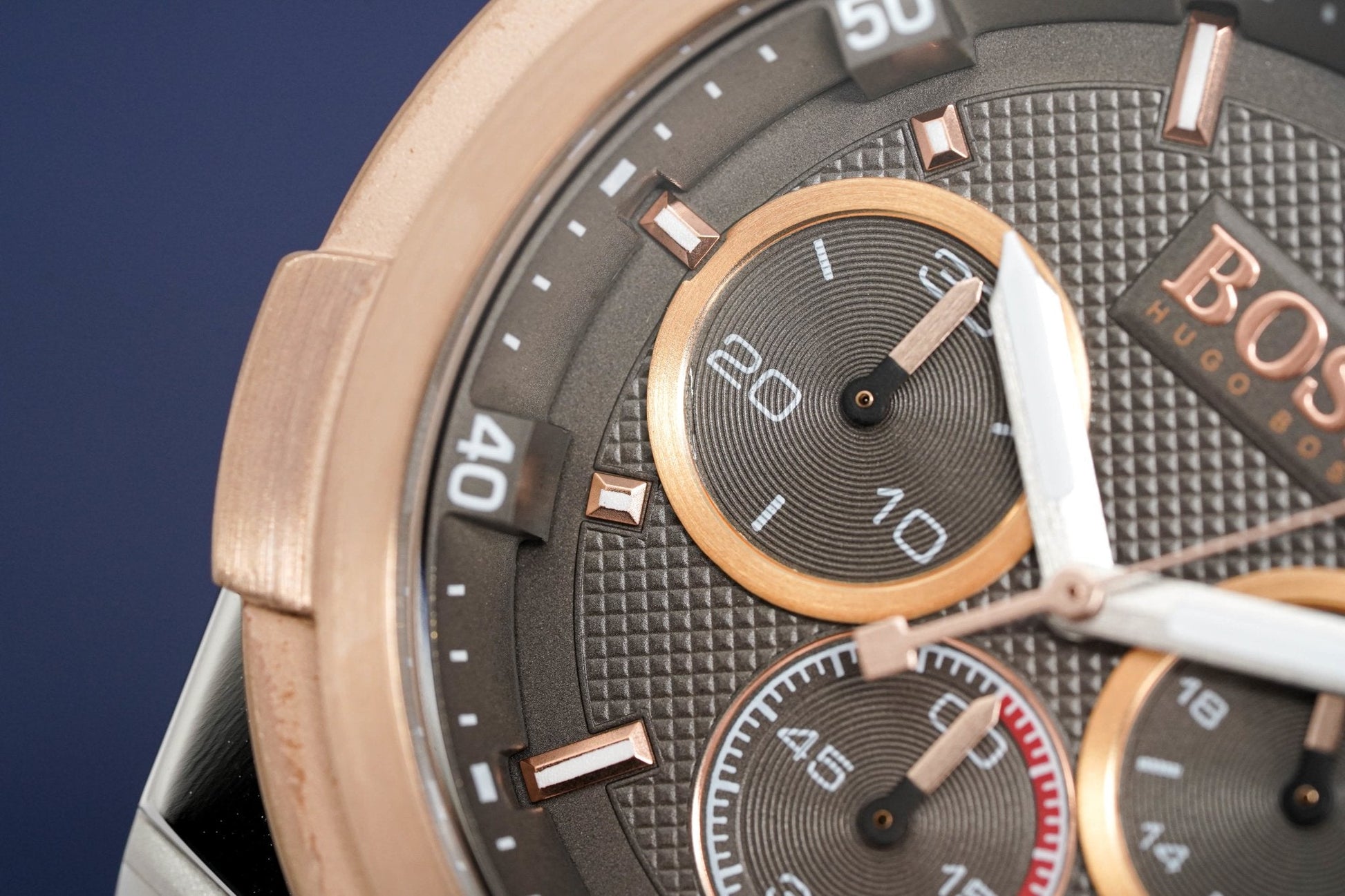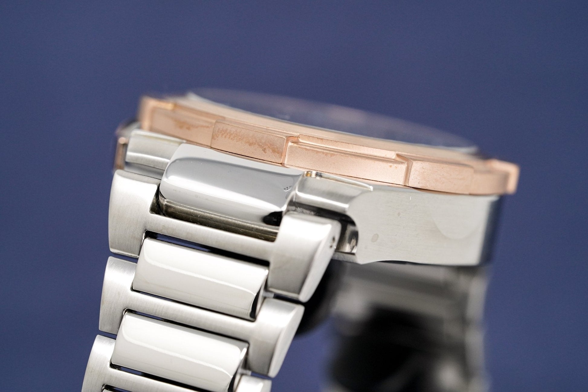 Caja de acero inoxidable de 45 mm. Cristal mineral resistente a arañazos. Bisel de acero con baño de PVD en oro rosa.