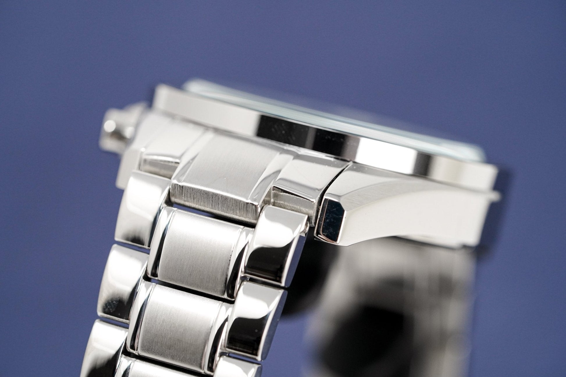 Caja de acero inoxidable de 44 mm. Cristal mineral resistente a arañazos. Bisel taquimétrico.