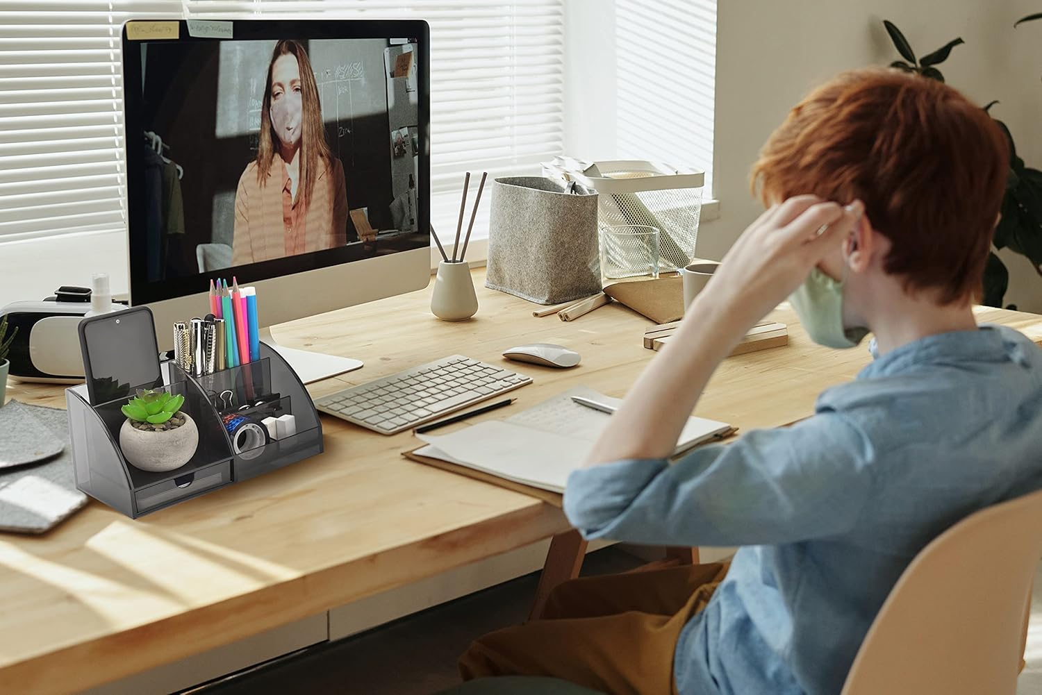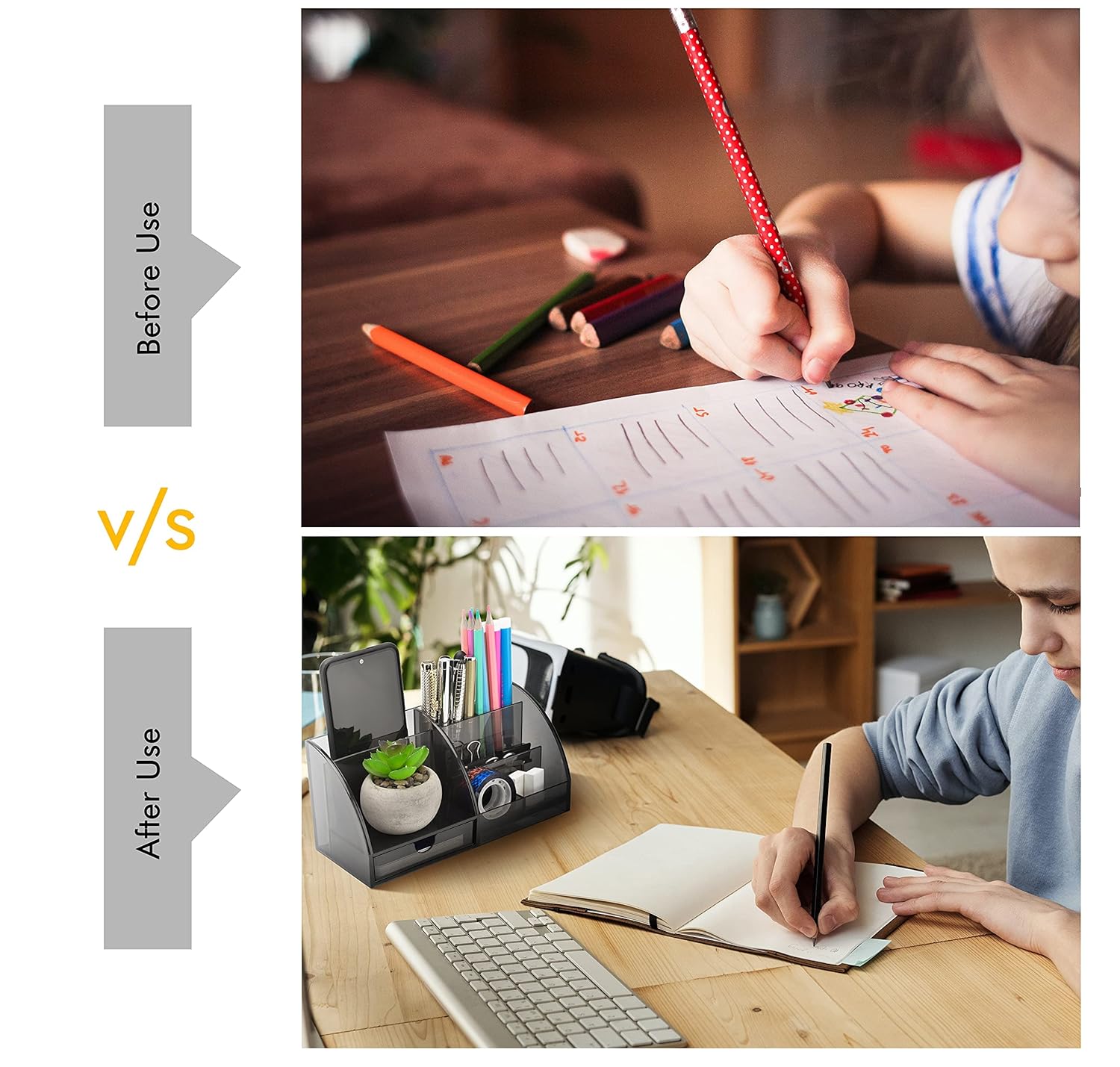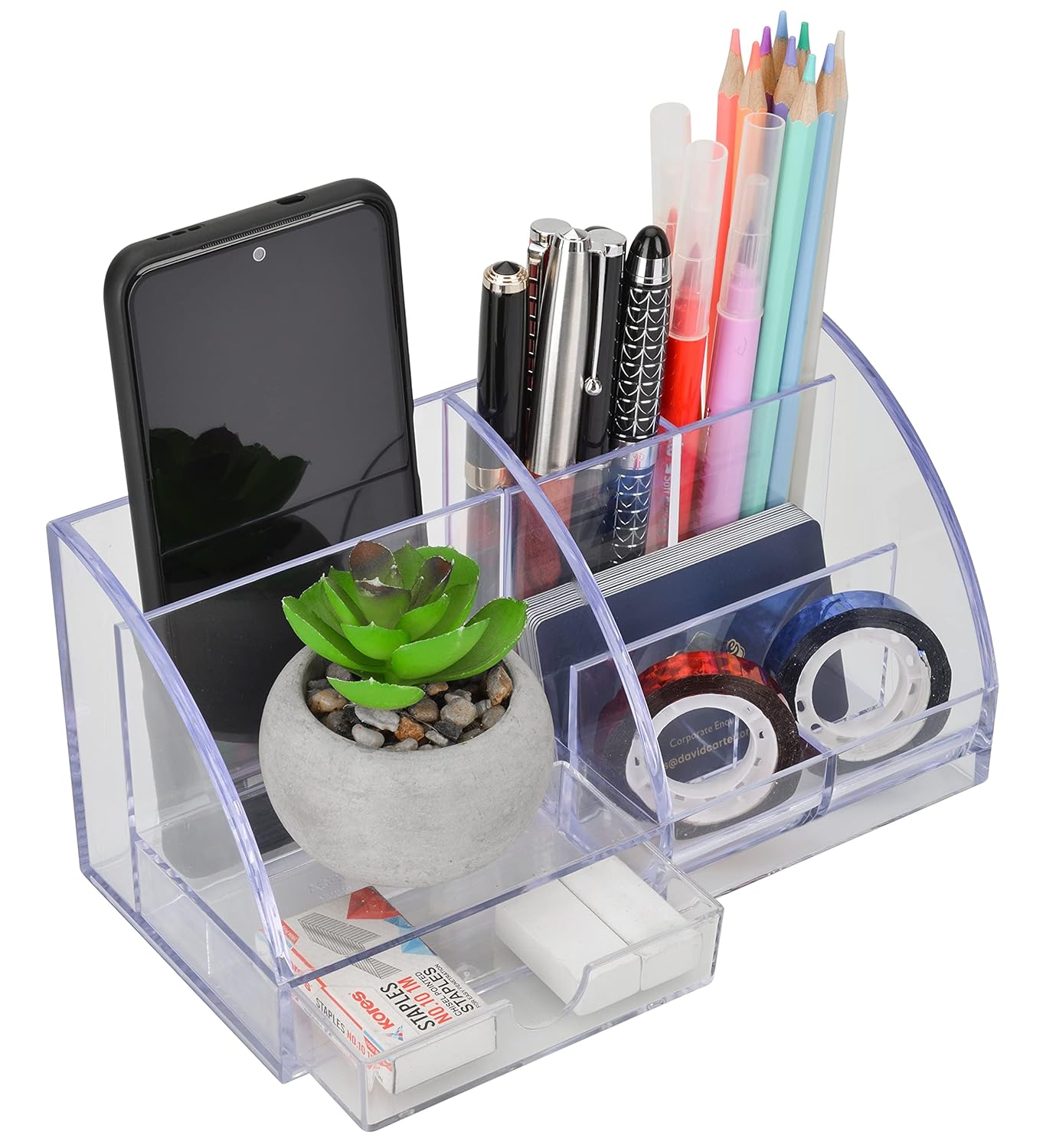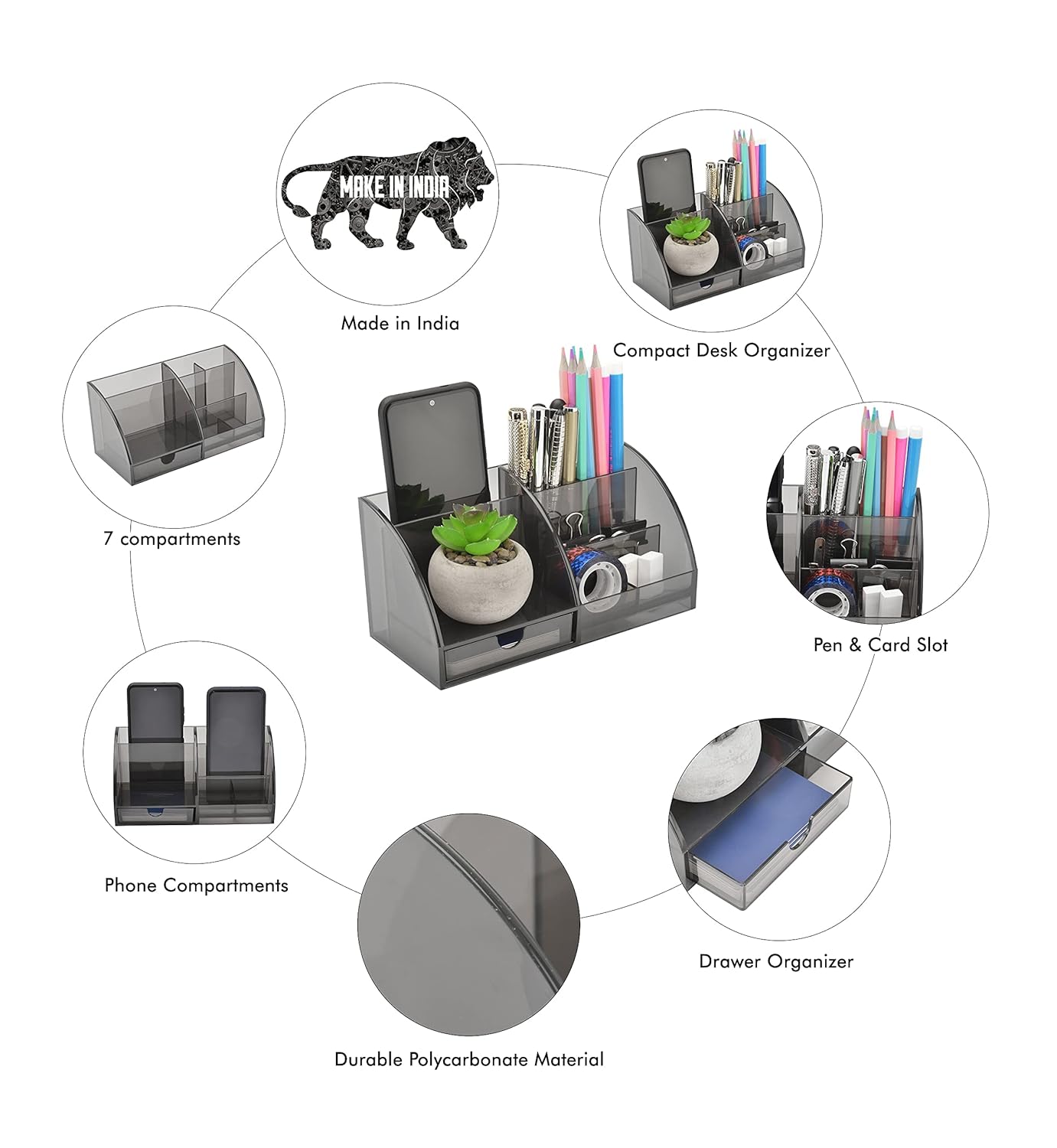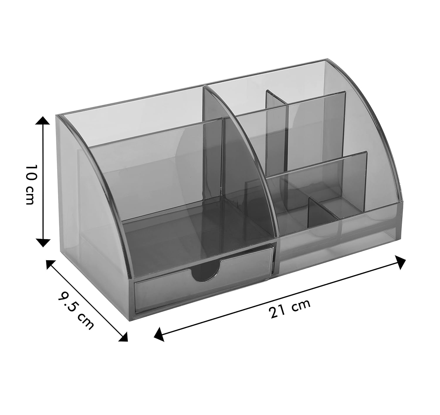 Transforma tu espacio de trabajo con este elegante organizador de escritorio en negro ahumado. Dile adiós al desorden y hola a la eficiencia con este potente organizador compacto para mantener tu espacio de trabajo ordenado y profesional.