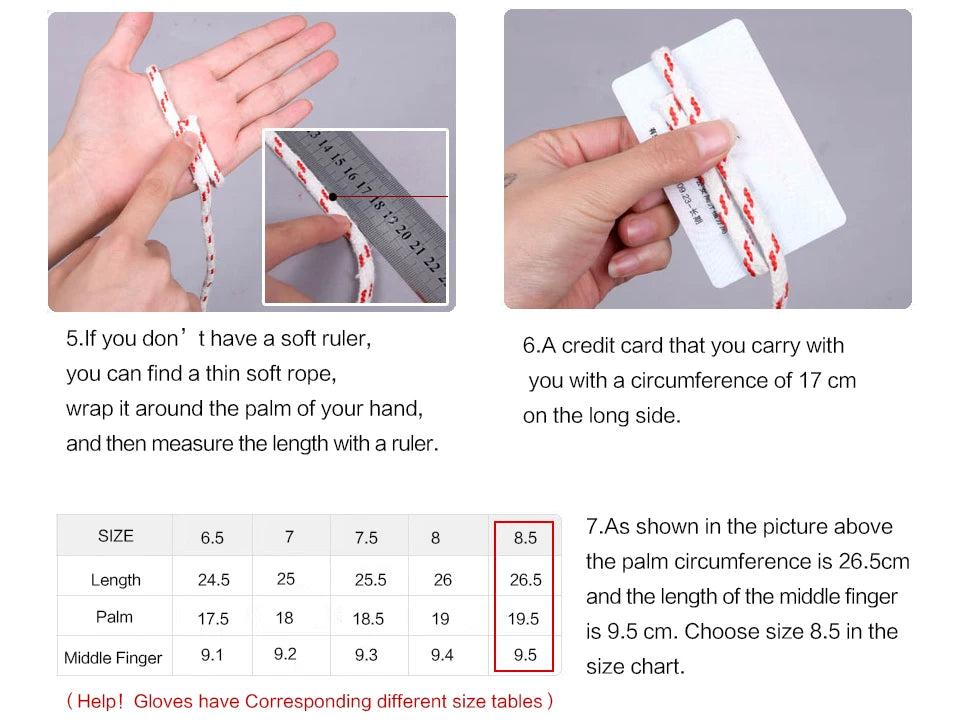 - Tamaño 8.5: Palma 19,2-20 cm, Dedo 8,6 cm