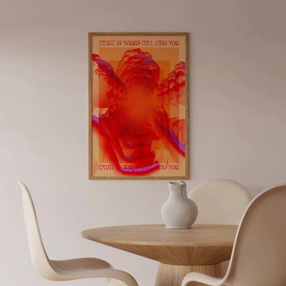 The What Is Yours Will Find You Print celebrates the spiritual principle that what is meant for you will come to you when you're in alignment. This empowering message reminds us to trust the universe's timing and have faith that opportunities, relationships, and experiences meant for us will find their way to us. The surreal layered sculpture design in vivid reds and oranges creates a striking visual that captures attention while delivering its powerful message. Perfect for those who practice manifestation, believe in spiritual alignment, or simply need a reminder to trust the process. The bold colors and classical imagery create a piece that's both artistically compelling and spiritually meaningful.