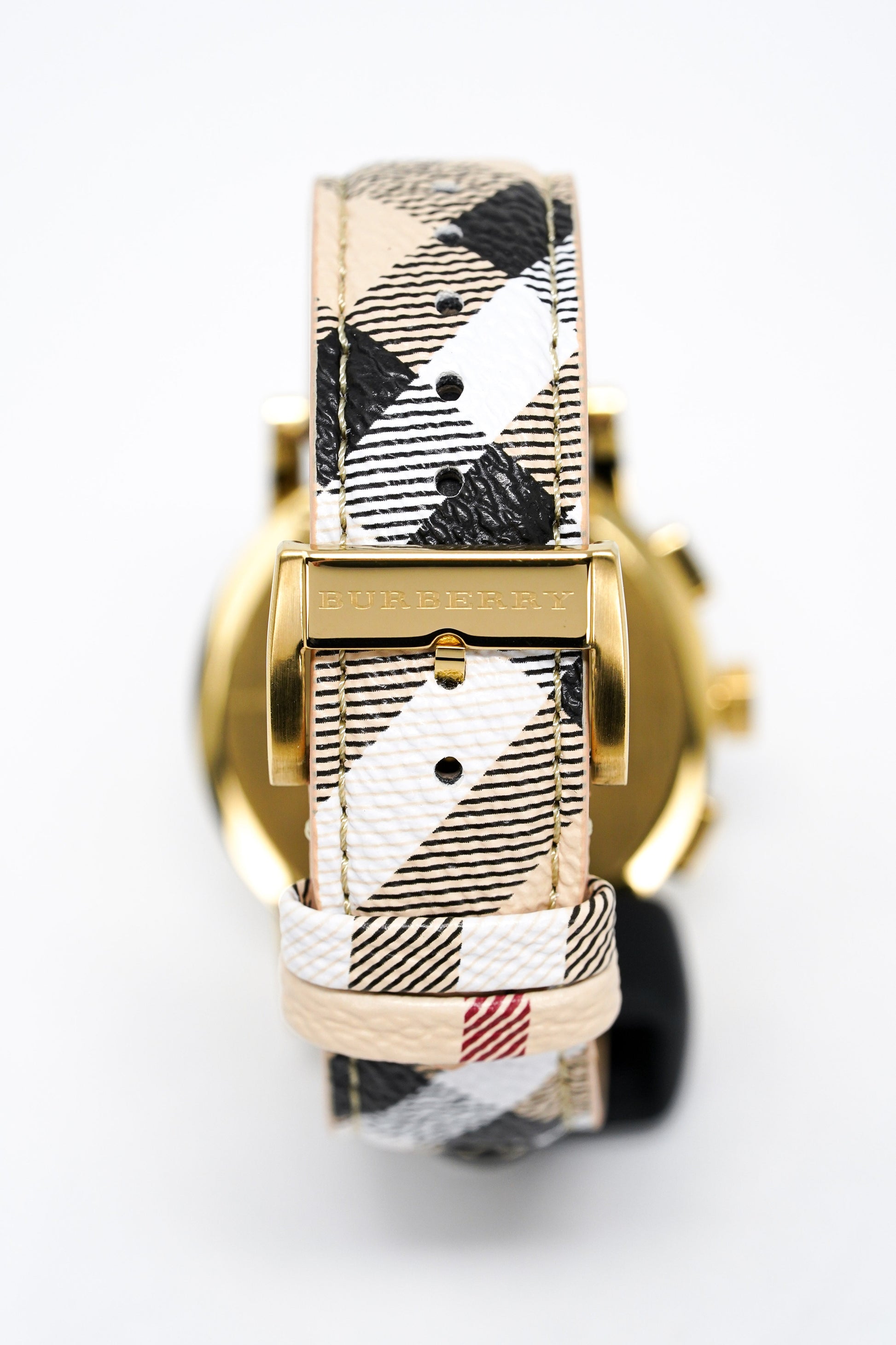 20mm Width Leather Strap with Iconic Burberry Pattern and Gold PVD Plated Buckle Clasp.