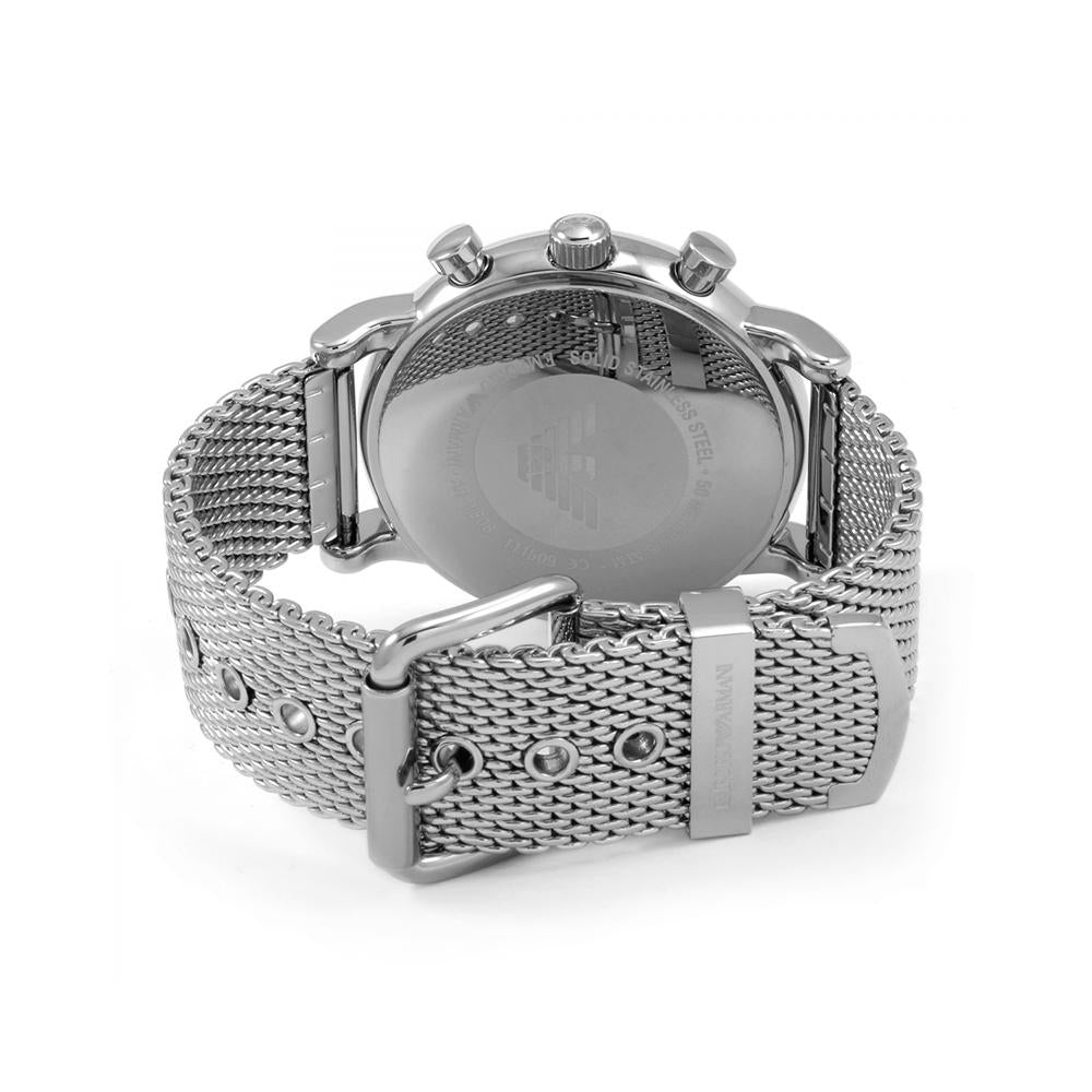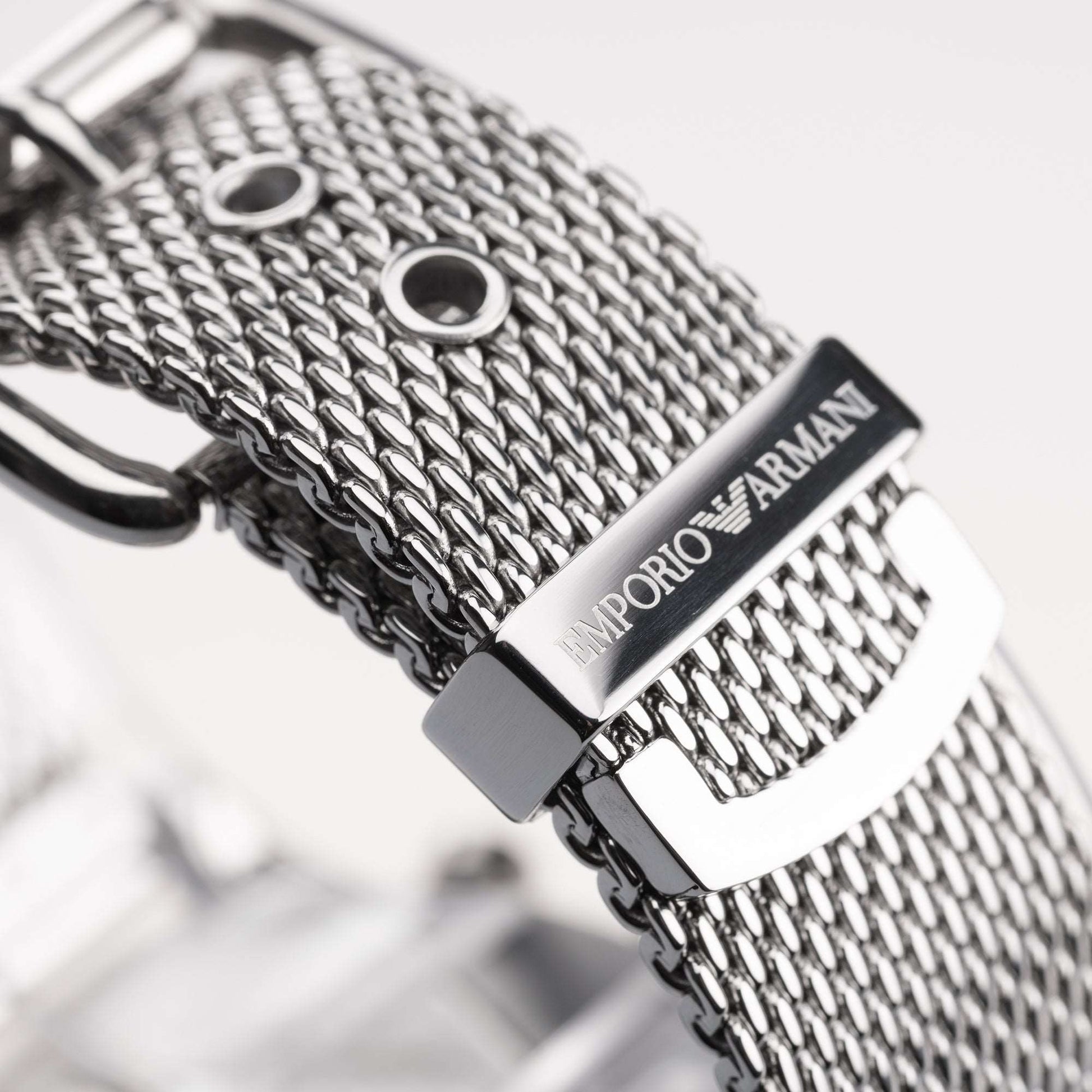 Enhance your elegance with this sophisticated Emporio Armani chronograph. Features a sleek stainless steel mesh bracelet and striking black dial, perfect for any occasion from formal events to casual outings.