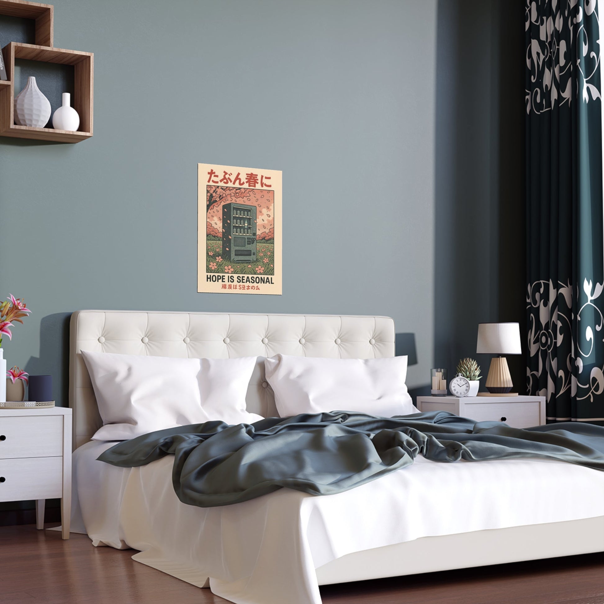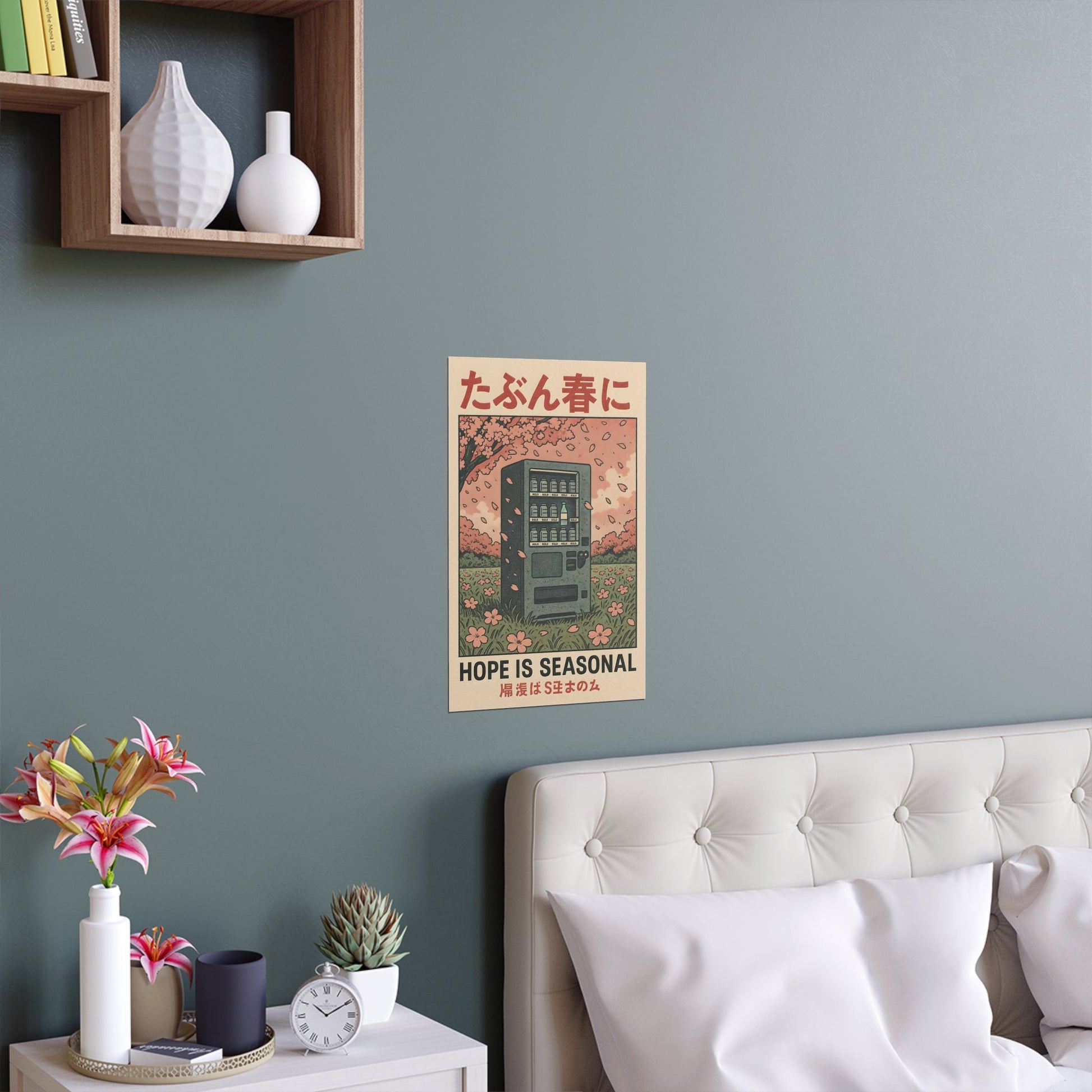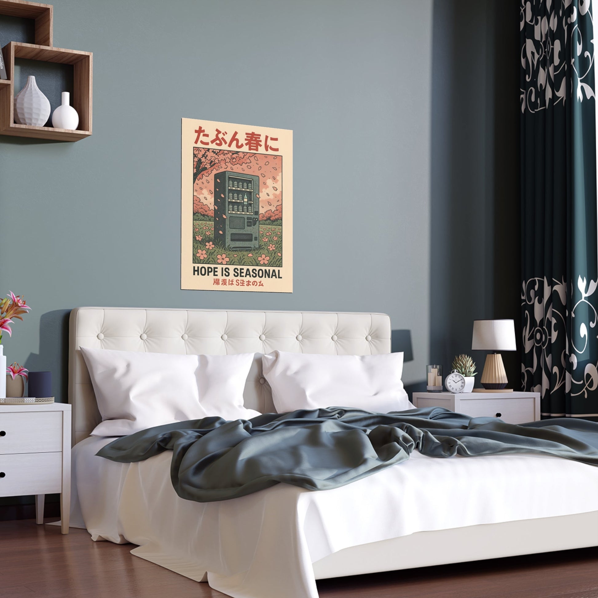 Reflect on life's fleeting beauty with the Hope Is Seasonal Print. This poignant poster features a lone vending machine beneath blooming cherry blossoms that brings melancholic charm and thoughtful energy to any space, perfect for those who appreciate art that explores the transient nature of hope and beauty.